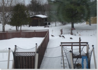 These wild turkey have been walk across the back yard almost everyday since the snow got deep. Sometimes as many as 30 birds will go across, what a great sight.